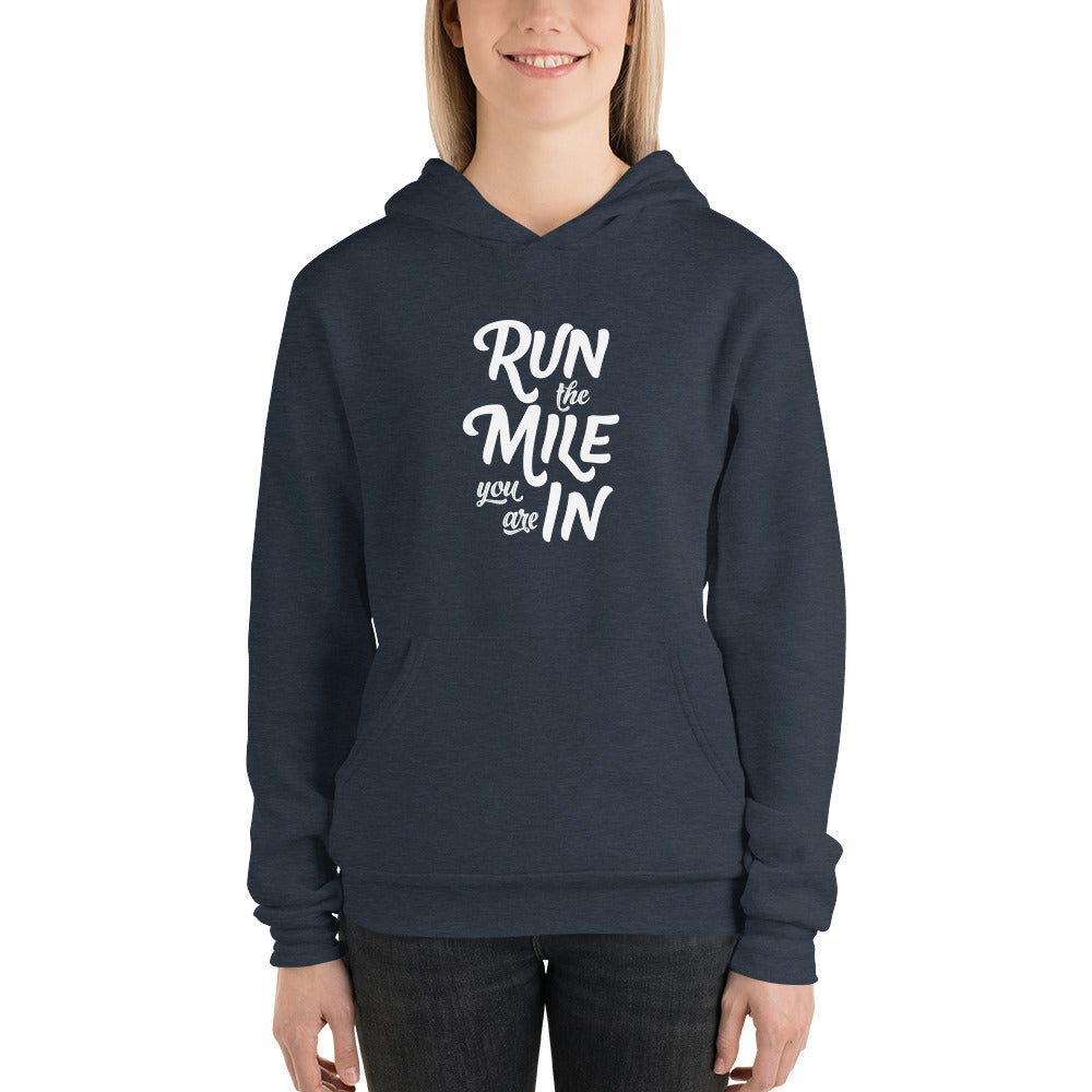 You can't rerun the mile behind you and the mile is ahead is yet to arrive. Show your focus on the mile you are in with this soft and comfy unisex hoodie that fits all your hoodie needs. The fleece fabric makes it a great partner all year round, be it a summer evening on the beach, or a Christmas dinner in a mountain cabin.
