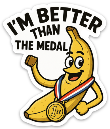 Celebrate your post-race priorities with our Better Than the Medal banana sticker! 🍌 This fun, durable vinyl sticker features a victorious, medal-wearing banana reminding everyone that the real prize is waiting at the snack table. Perfect for runners, cyclists, triathletes—or anyone who knows a banana beats bling. Stick it on your water bottle, laptop, or gear bag and keep the finish line fun going all year long.
