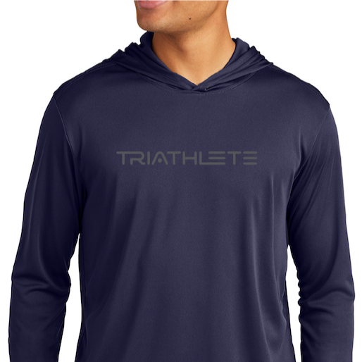 The font of the hoodie sports the word TRIATHLETE in a space age font.