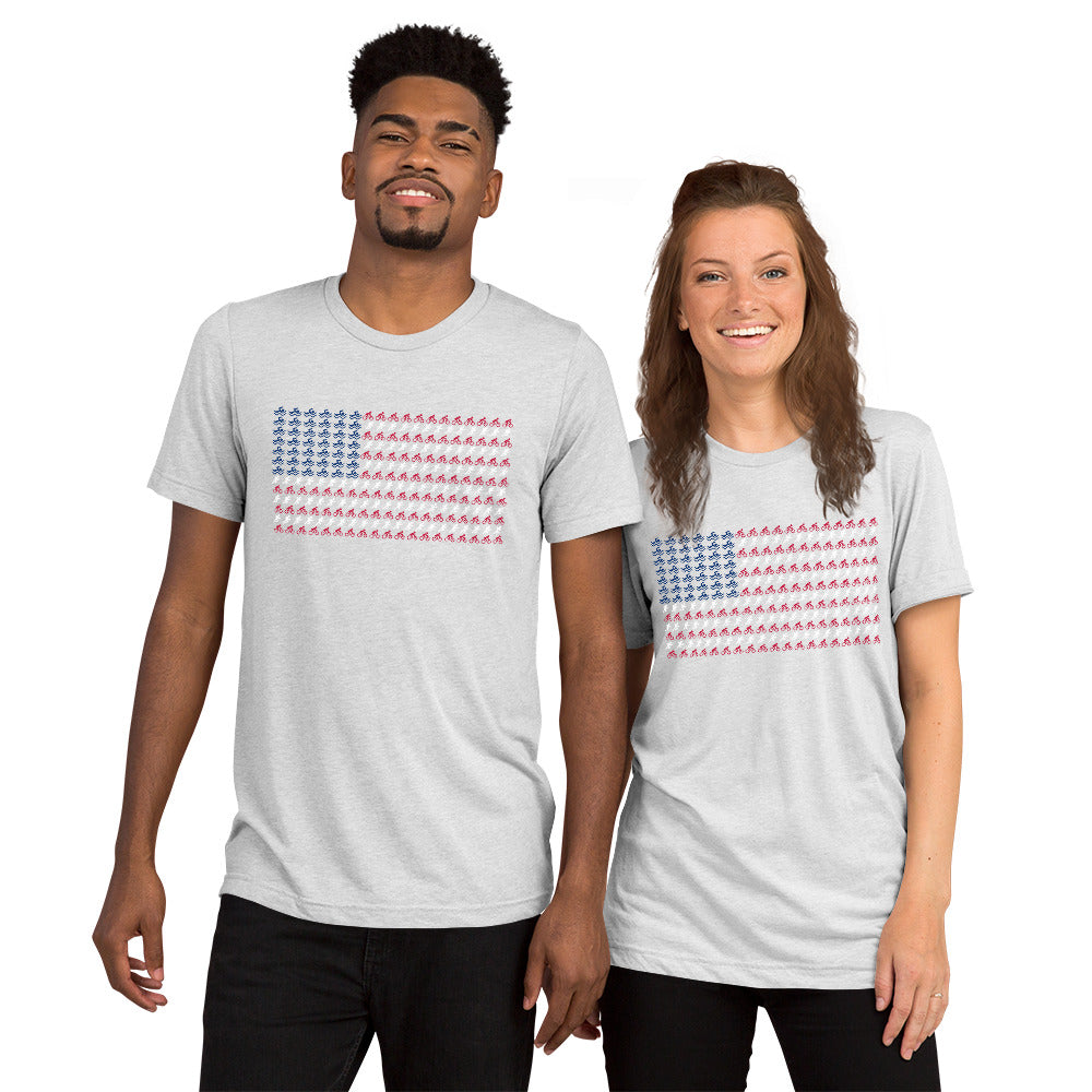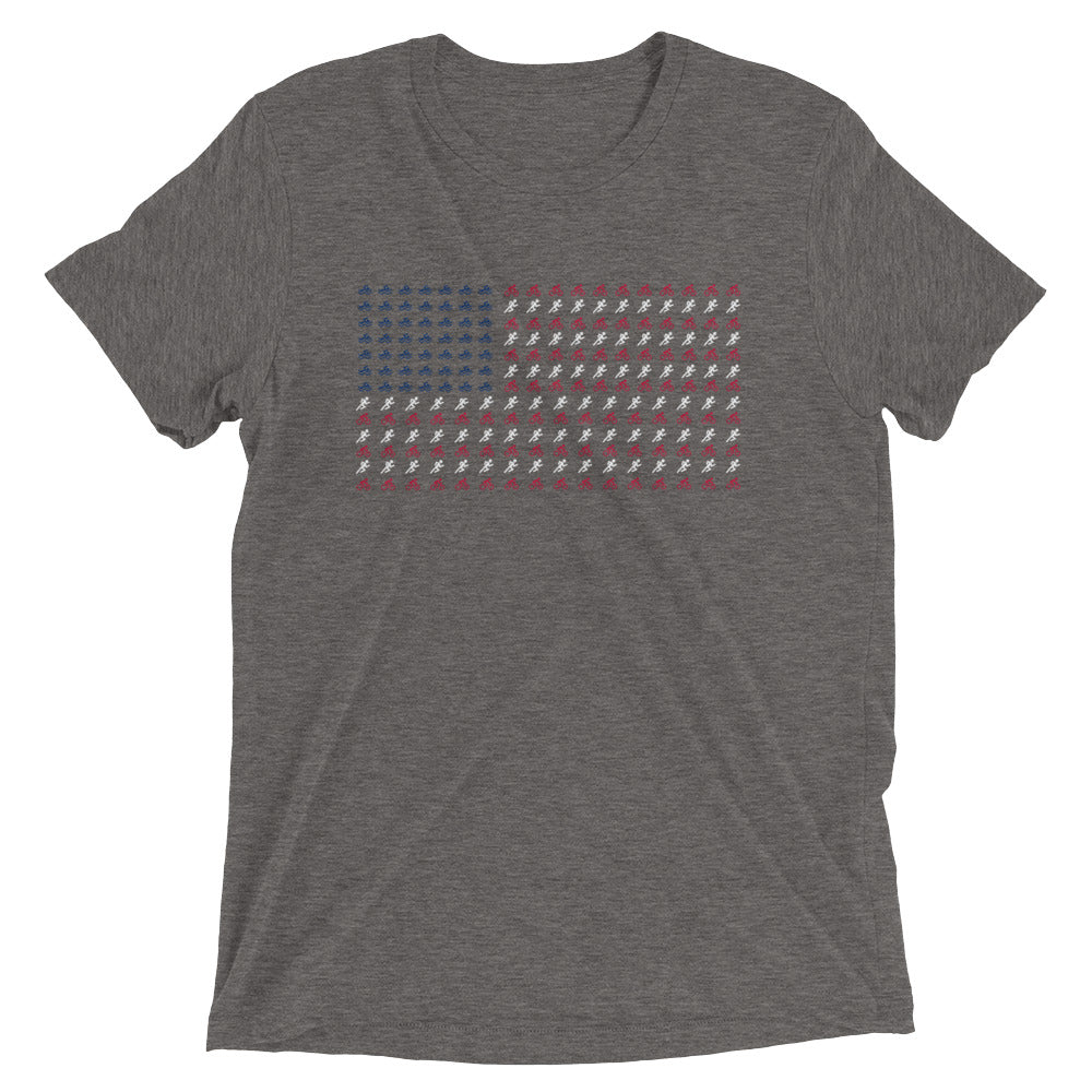 Celebrate Independence Day in true triathlete fashion with this one-of-a-kind shirt that embodies the spirit of triathlon and American pride. Its irresistibly soft fabric ensures you'll never want to take it off, making it the perfect addition to your post-workout loungewear or a standout piece at your Independence Day BBQ.