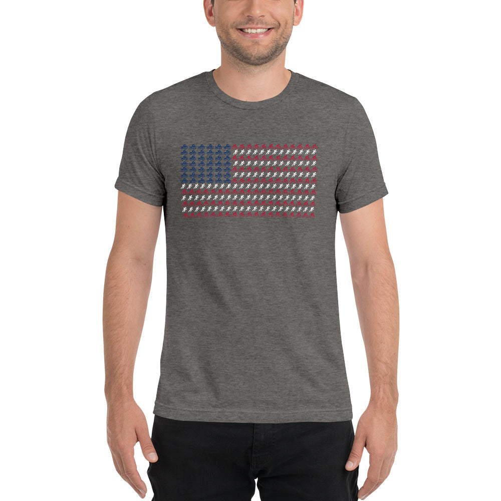 Discover our exclusive Triathlete Patriot T-shirt – where sport meets patriotism in a perfect blend of style and comfort! This super-soft shirt features a unique design with the iconic USA flag, where the white bars are meticulously crafted from runner icons, the red bars from bike icons, and the blue field from swim icons.