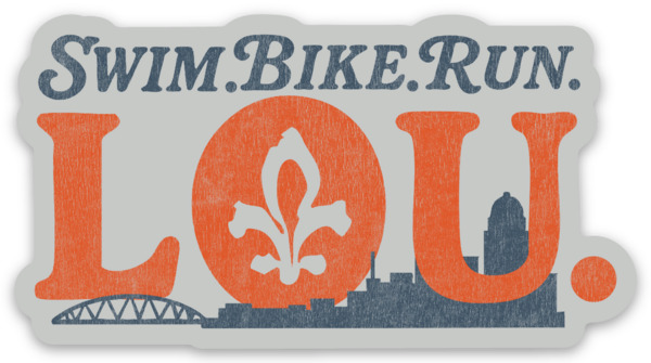 This SWIM. BIKE. RUN. LOU. sticker is inspired by the bold energy of race day and the classic vibe of old-school Americana.