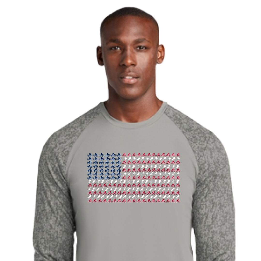 Elevate your athleisure game with our "Triathlete Patriot" Digi Camo Long Sleeve Shirt. – the ultimate blend of comfort and style. This shirt features the iconic USA flag design, intricately crafted with runner, bike, and swim icons. A subtle digi camo pattern gives this moisture-wicking, breathable performance tee a unique edge.